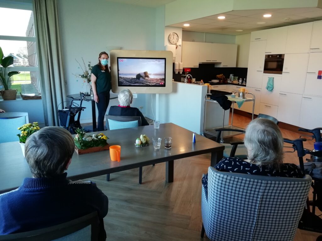 De Waadwente is sinds 2015 onderdeel van ZuidOostZorg. De kamers van de bewoners zijn gelegen rondom een aantal gezellige huiskamers waar er gezamenlijk gegeten wordt of activiteiten worden gedaan. De kantelbare BelevenisTafel neemt Nina moeiteloos mee van de ene naar de andere huiskamer. Nina: “In corona-tijd is het makkelijk je aan de basisregels te houden met de BelevenisTafel in de verticale stand. Ik bedien het scherm dan, terwijl de ouderen er vanaf een afstandje naar kijken. Zo kunnen we veilig werken.”