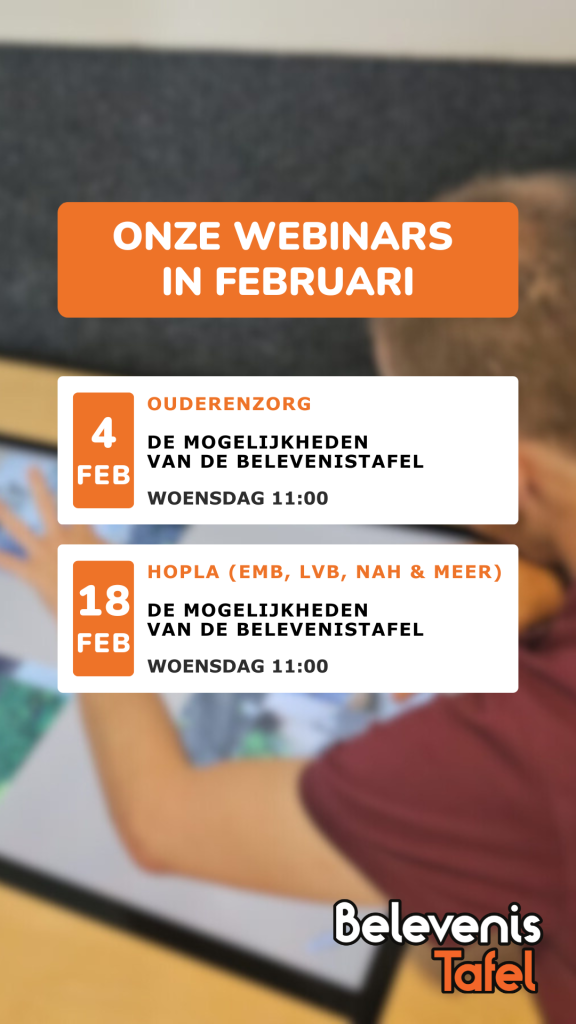Op woensdag 18 februari (11.00–12.00 uur) organiseren we een gratis webinar speciaal voor Hopla‑gebruikers. Je ontdekt hoe je de BelevenisTafel veilig opstart, de belangrijkste basisfuncties gebruikt, snel je weg vindt in de menu’s en passende applicaties kiest voor jouw doelgroep. Ook hier kun je al je vragen live stellen.